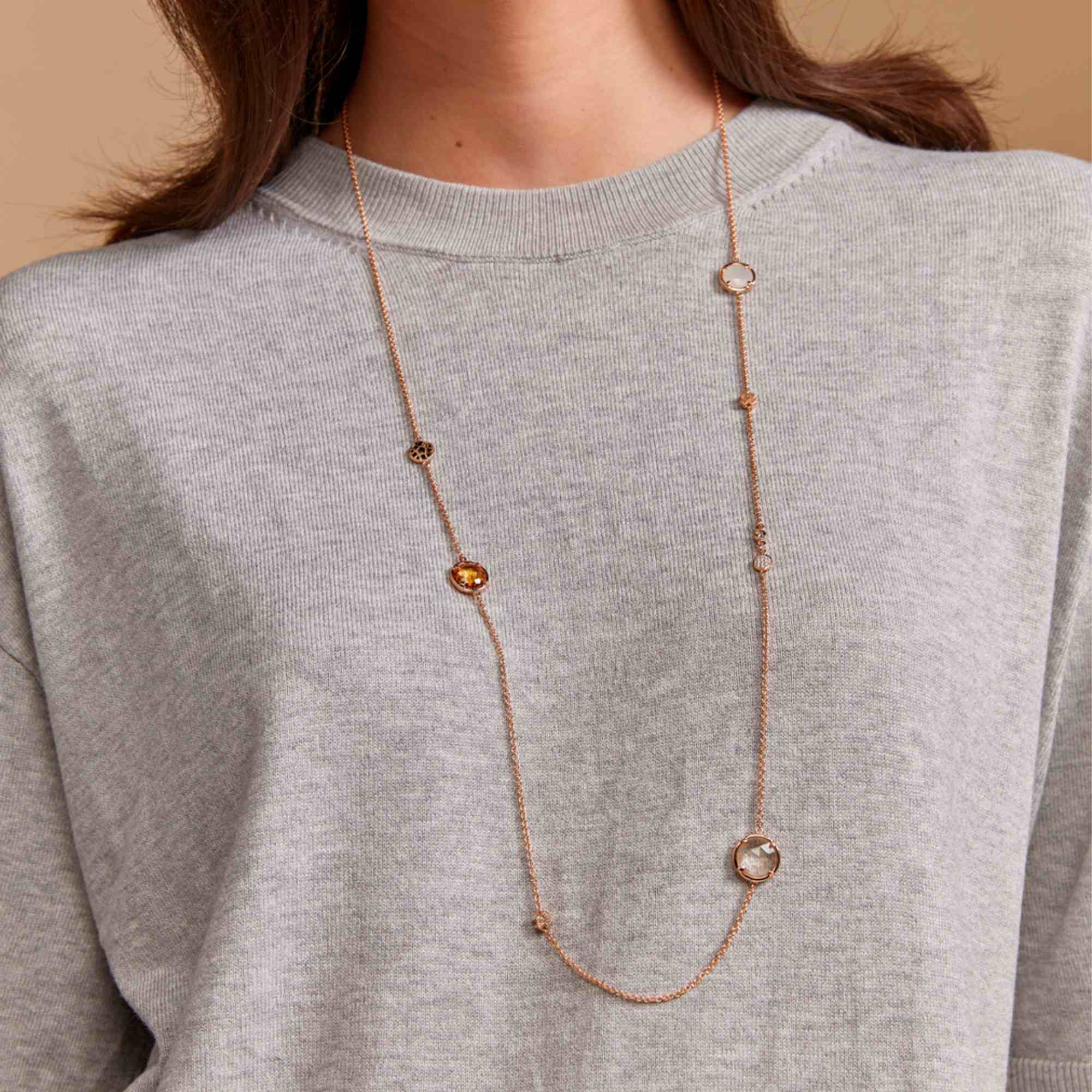 Ref. 8CR4429DAY - Lange (90 cm) Kette mit verschiedenen Bron-Motiven und Edelsteinen im Briolette-Schliff. Alles in der Daybreak Farbpalette.