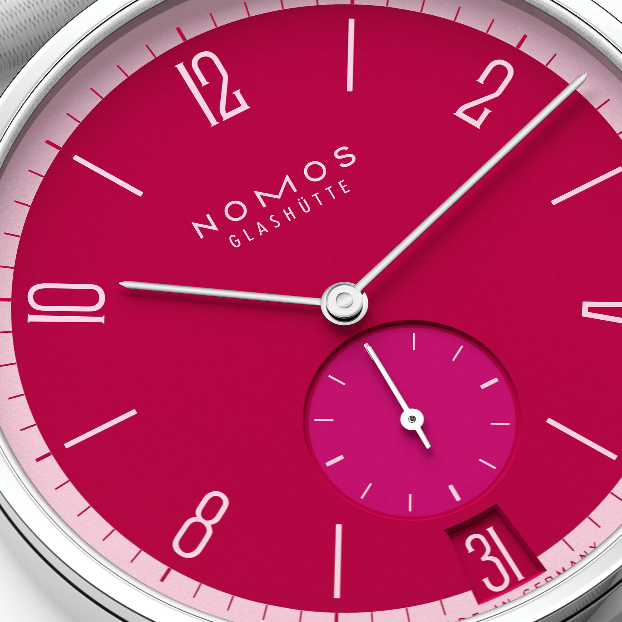 Ref.179.S30 - Die Ikone in Farbe. Voller Kraft und Komplexität. Für die Sonderedition der Handaufzugsuhr Tangente 38 mit Datumsfunktion wurden zahlreiche Elemente des Zifferblatts individuell auf den Charakter der Uhr abgestimmt. 31 besondere Modelle für jeden Tag des Monats sind daraus entstanden, 31 Persönlichkeiten – auf je 175 Exemplare limitiert. Tangente Datum Chili hat das intensivste Rot all unserer roten Uhren: Purpurrot. Eine feurige Uhr, aber auch glamourös. In mutigen Farbkombinationen macht sie einen noch größeren Eindruck: Mit Olivgrün, Pink oder Schwarz. Wer es gerne etwas reduzierter mag, trägt sie zu Weiß.