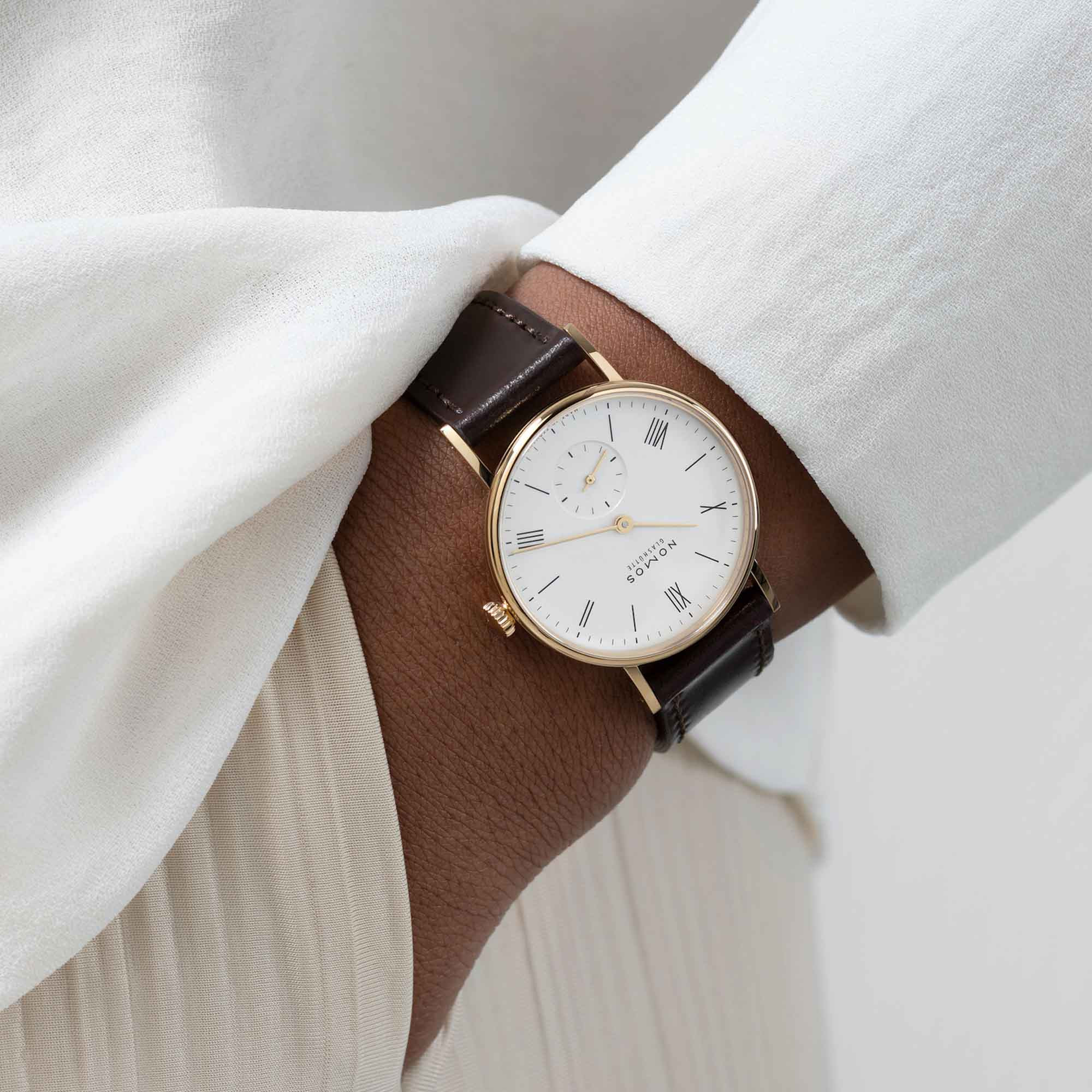 Ref. 210 - Klein und fein, aus Gold. Mit ihren römischen Ziffern und dem goldenen Gehäuse ist diese Uhr ein Klassiker. Eine zurückgenommene goldene Lünette umrahmt das weiß-versilberte Blatt, die Bandanstöße folgen in leichtem Bogen der Form des Handgelenks und sorgen für guten Tragekomfort. Ludwig Gold 33 ist ein präziser Zeitmesser mit Manufakturkaliber, gefertigt in der 175-jährigen Uhrmachertradition Glashüttes.